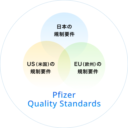 ファイザーでは、医薬品を製造販売する国の規制要件に準拠するだけでなく、欧州や米国、日本等、世界各国の規制要件を全て網羅したグローバルでの品質基準「Pfizer Quality Standards」を設定し遵守することにより、世界各国で製造販売するファイザー製品の品質を同一の基準で保証しています。