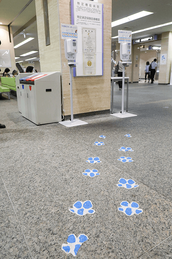 また本院の外来の入口の床に「ゾウの足跡」のイラストを描いています。これは来院した患者さんがこの「ゾウの足跡」をたどって自然と手指消毒に導かれるようにしたものです。