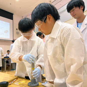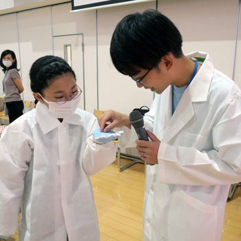 社員がアイディアを出し合い、今年は錠剤を作るだけでなく、溶かした時の崩れ方や溶け方を観察するプログラムを作りました。口の中で唾液あるいは少量の水分でも速やかに崩壊する「口腔内崩壊錠(OD錠)」の設計・製造技術を持っている名古屋工場ならではの実験と言えるでしょう。