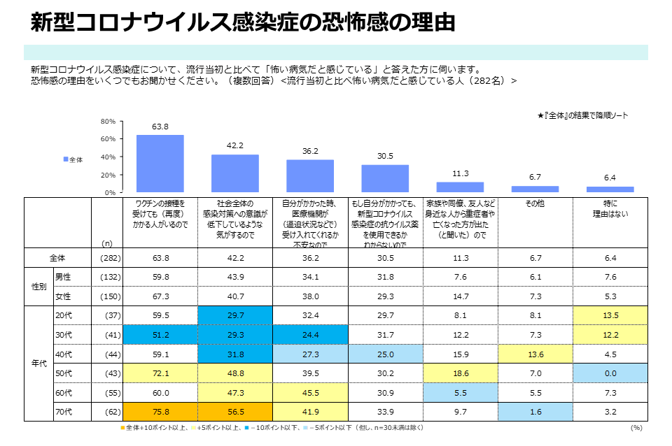 「流行当初よりも怖い病気と感じている」と回答した282人にその理由を複数回答で尋ねたところ、「ワクチンの接種を受けても(再度)かかる人がいるので」が63.8%(180人)で最も多く、「社会全体の感染対策への意識が低下しているような気がするので」が42.2%(119人)、「自分がかかった時、医療機関が(逼迫状況などで)受け入れてくれるか不安なので」が36.2%(102人)の回答が続いた。