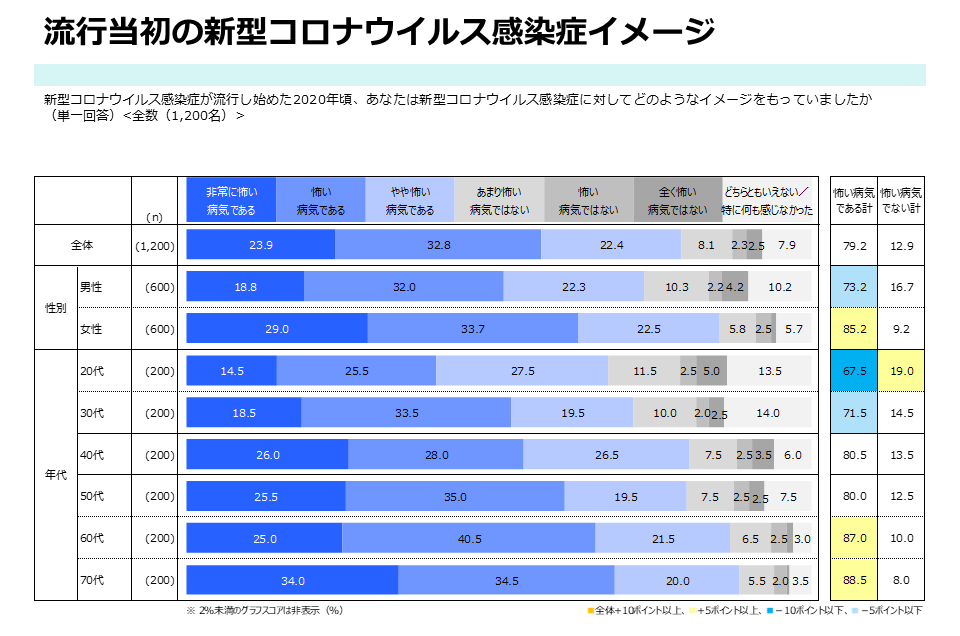 新型コロナウイルス感染症流行当初、「怖い病気である(非常に怖い病気である/怖い病気である/やや怖い病気である)」と感じていた方は79.2%(950人)。