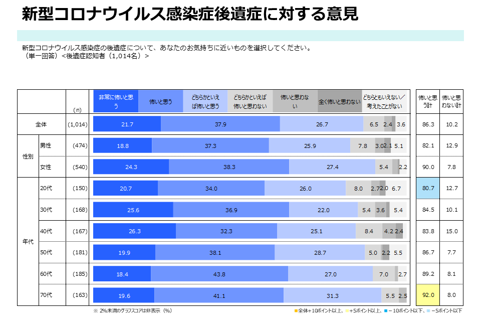 新型コロナウイルス感染症の後遺症について、後遺症の存在や諸症状をご存知でない方を除く1,014人に伺ったところ、86.3%(875人)が「怖いと思う(非常に怖い/怖い/やや怖い)」と回答。