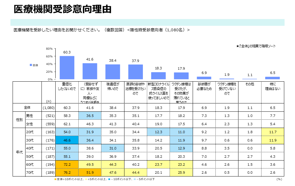 受診希望の理由について、受診意向のある1,080人(442人+393人+245人)に複数回答で尋ねたところ、「重症化したくないので」の回答が60.3%(651人)。また、「(受診せずに)家族や友人・同僚などにうつすと迷惑をかけるため」が41.6%(449人)、「後遺症が怖いので」が38.4%(415人)の回答が続いた。