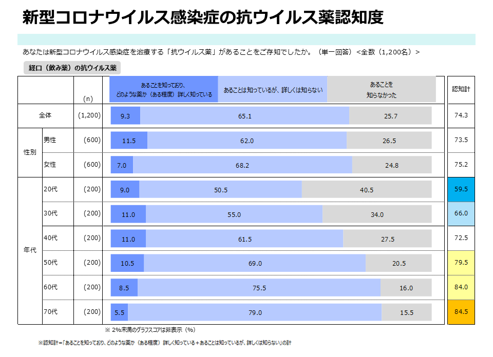 新型コロナウイルス感染症に対する経口抗ウイルス薬の認知状況を尋ねたところ、「治療薬があることは知っているが、詳しくは知らない」が65.1%(781人)で最も多く、「治療薬があることを知っており、どのような薬か(ある程度)詳しく知っている」は9.3%(111人)。