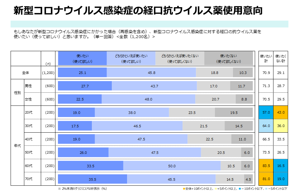 新型コロナウイルス感染症に感染した場合、経口抗ウイルス薬を「使って欲しい(使って欲しい/どちらかと言えば使ってほしい)」と考えている方は70.9%(851人)だった。