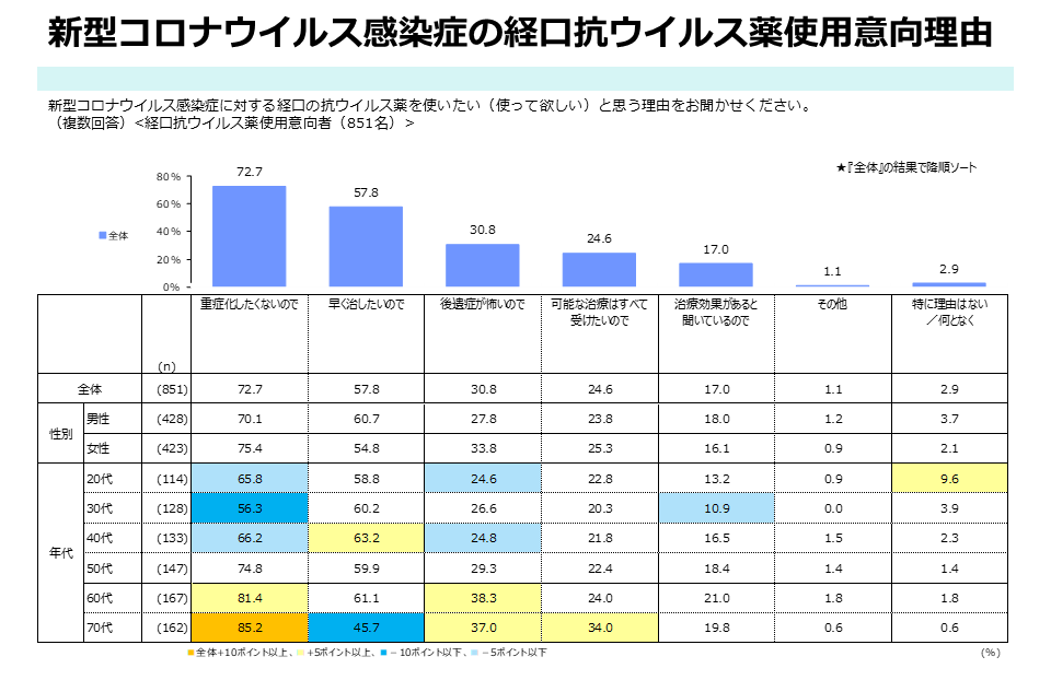 経口抗ウイルス薬の使用を希望する851人に対し、その理由について複数回答で尋ねたところ、最も多かったのは「重症化したくないので」が72.7%(619人)で、「早く治したいので」が57.8%(492人)、「後遺症が怖いので」が30.8%(262人)と続いた。