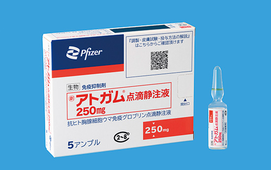 ファイザー株式会社(本社:東京都渋谷区、代表取締役社長:原田明久)は本日7月24日、免疫抑制剤『アトガム®点滴静注液250mg』 (一般名:抗ヒト胸腺細胞ウマ免疫グロブリン、以下、本剤)を発売しました。