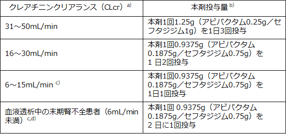 用法及び用量 | 通常、成人には1回2.5g(アビバクタムとして0.5g/セフタジジムとして2g)を1日3回2時間かけて点滴静注する。なお、腹膜炎、腹腔内膿瘍、胆嚢炎、肝膿瘍に対しては、メトロニダゾール注射液と併用すること。 |